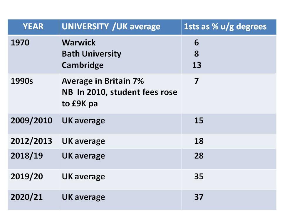 Now to university standards. You can see the explosion of first class degrees since 2010, the year that student fees rose to £9000 and a culture developed in which students were treated as customers: